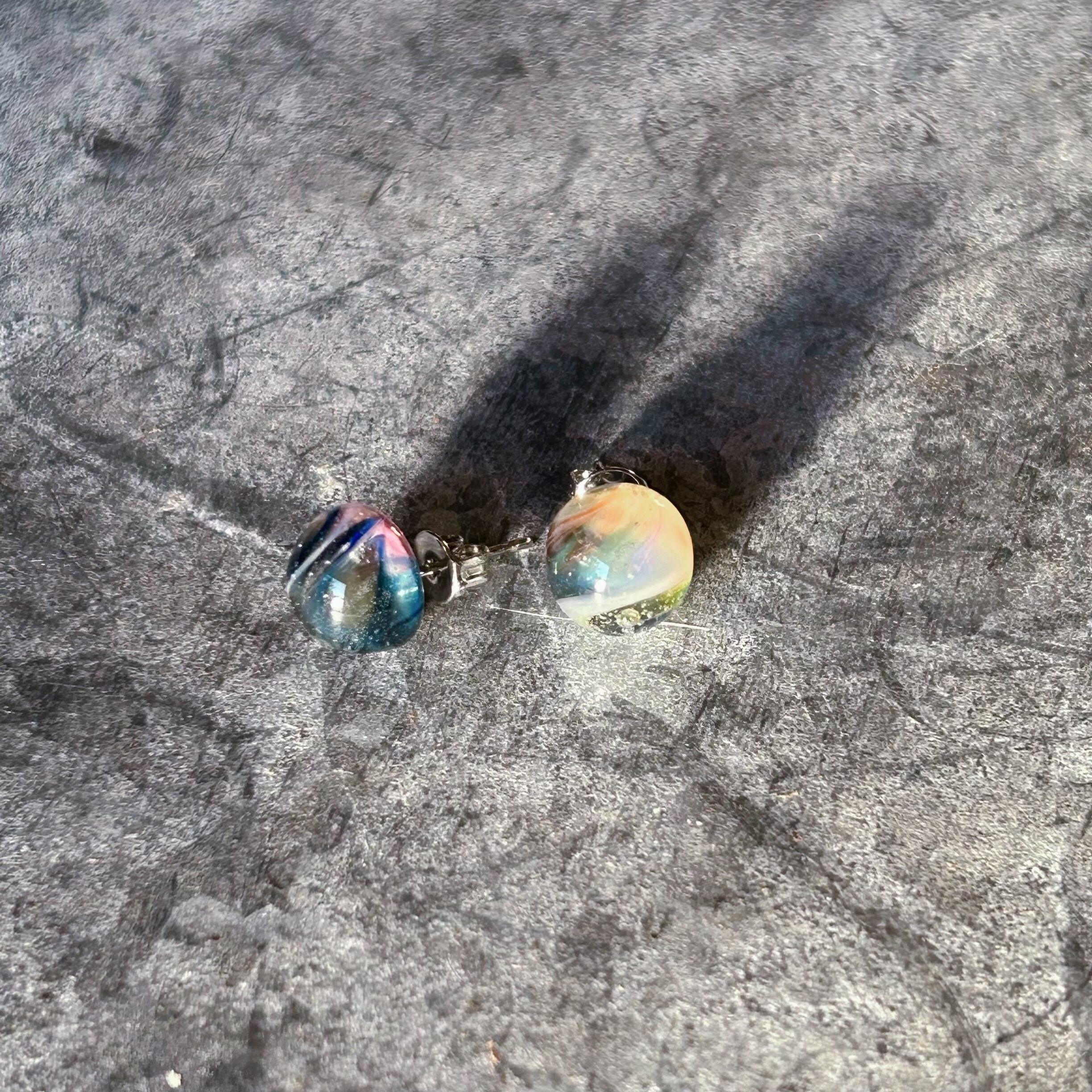 透明なガラスに複数の色ガラスをマーブル模様に入れました。小さな気泡がたくさん入っているので、光が当たるとキラキラと綺麗です。